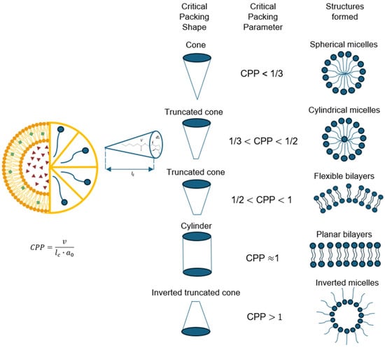 A wide variety of structures may be formed under the same critical packing parameter, as illustrated in Figure 2. However, entropy favors the structure with the smallest number of aggregated molecules because it will have less free energy. In other words, larger structures are entropically disadvantaged and small structures increase the surface area above an optimal value, making them energetically disadvantaged. Depending on this value, amphiphilic structures can be organized from spherical and cylindrical micelles to inverted structures according to the CPP value ranges [26].
