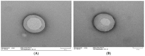 TEM micrographs of niosomes with encapsulated triacontanol. Niosomes with encapsulated triacontanol ((A,B) scale bar 0.1 μm).