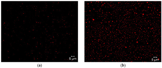 Micrographs of niosomes with Nile Red fluorochrome. Blank niosomes (a), niosomes with encapsulated molecules (b).