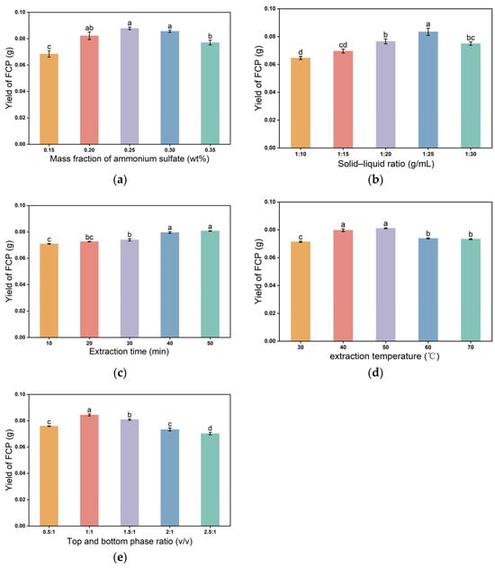 Effects of single-factor parameters on the yield of Ficus carica polysaccharides (FCP): (a) ammonium sulfate concentration (15–35 wt%, fixed ultrasonic time 30 min, temperature 50 °C, solid–liquid ratio 1:25 g/mL); (b) solid–liquid ratio (1:10–1:30 g/mL, fixed ultrasonic time 30 min, temperature 50 °C, ammonium sulfate concentration 25 wt%); (c) ultrasonic time (10–50 min, fixed temperature 50 °C, solid–liquid ratio 1:25 g/mL, ammonium sulfate concentration 25 wt%); (d) extraction temperature (30–70 °C, fixed ultrasonic time 30 min, solid–liquid ratio 1:25 g/mL, ammonium sulfate concentration 25 wt%); (e) top/bottom phase volume ratio (0.5:1–2.5:1 v/v, fixed ultrasonic time 30 min, temperature 50 °C, solid–liquid ratio 1:25 g/mL, ammonium sulfate concentration 25 wt%). The y-axis represents the FCP yield (g). All experiments were conducted at an ultrasonic power of 300 W.