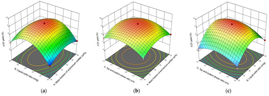Three-dimensional response surface (a–c) showed the effect of interactions among three factors on the FCP yield. Part A is the ammonium sulfate concentration (wt%), part B is the liquid–solid ratio (v/v), and part C is the top and bottom phase volume ratio, respectively.