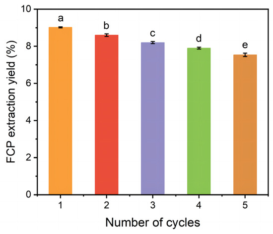 The cycle stability and recyclability of DESs were evaluated by the yield of FCP. The results were shown in Figure 3. After the first recovery, the yield of FCP was calculated to be 9.02 ± 0.02%, which was only 0.20% lower than that of the first extraction [52]. With the increase in the number of cycles, the yield of FCP gradually decreased. When the number of cycles reached five, the yield of FCP remained above 7%, indicating that the desorption system used in the TPP system had good cycle stability and recyclability [53].