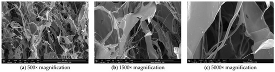 The microstructure of FCP samples was visualized by scanning electron microscopy. The SEM images at 500×, 1500×, and 5000× magnifications are shown in Figure 4, respectively. At the lower 500× magnification, the overall microstructure of FCP could be clearly observed, showing relatively loose filamentous and reticulated structures, which indicated a disordered microstructure. At 1500× magnification, the morphology of the filamentous and reticular structures of FCP could be more clearly observed. At 5000× magnification, the polysaccharide microfibers in FCP showed a flat and straight morphology with a regular shape. This indicated that the TPP system did not destroy the polysaccharide network of FCP and enabled good preservation of the polysaccharide structure during the extraction process. Notably, no spherical or granular aggregates were observed at these magnifications, indicating the absence of proteins and the high purity of extracted FCP. These results demonstrated the effectiveness of TPP-DES extraction in effectively separating polysaccharides [54].