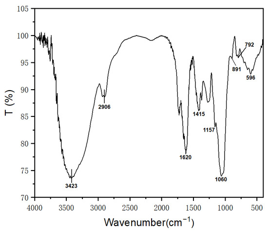 FT-IR spectroscopy was used to investigate the molecular structure characteristics of FCP samples. The FT-IR spectra of FCP are shown in Figure 5. The prominent characteristic peak at 3423 cm−1 was caused by the O-H stretching vibration of hydroxyl groups, indicating the presence of hydrogen bonding within the polysaccharide. The weaker peak at 2906 cm−1 was attributed to the C-H stretching vibration. The band at 1620 cm−1 was caused by the C=O stretching vibration and hydrogen bonding coupled with COO, indicating the presence of bound water, while the peak at 1415 cm−1 indicated deformation vibration of the C-H bond. Two peaks in the region from 1000 to 1200 cm−1 indicated asymmetric stretching of C-O-C and C-O-H groups in the pyranose ring. Two characteristic peaks near 891 cm−1 and 792 cm−1 suggested the coexistence of α and β configurations of the pyranose, with the 891 cm−1 peak representing the β-configuration and the 792 cm−1 peak representing the α-configuration. Finally, the peak at 596 cm−1 showed the presence of pyran sugar rings.
