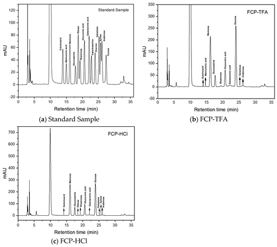 The monosaccharide composition of the standard sample (a), FCP-TFA (b), and FCP-HCl (c).