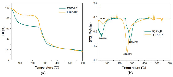 The thermodynamic properties of FCP samples were characterized using a thermogravimetric analyzer (1600LF, METTLER, Greifensee, Switzerland). The measurements were carried out in a nitrogen atmosphere (flow rate of 50 mL/min) over a temperature range of 30–600 °C with a heating rate of 10 °C/min. The percentage weight loss of FCP was determined from the TG curve, and the maximum decomposition temperature was determined from the DTG curve [72].