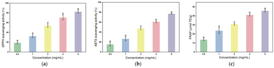 Variation in DPPH radical-scavenging percentage with varying concentrations for FCP (a), variation in ABTS radical-scavenging percentage with varying concentrations for FCP (b), and the antioxidant capacity of FRAP (c). The data were calculated from three parallel experiments.
