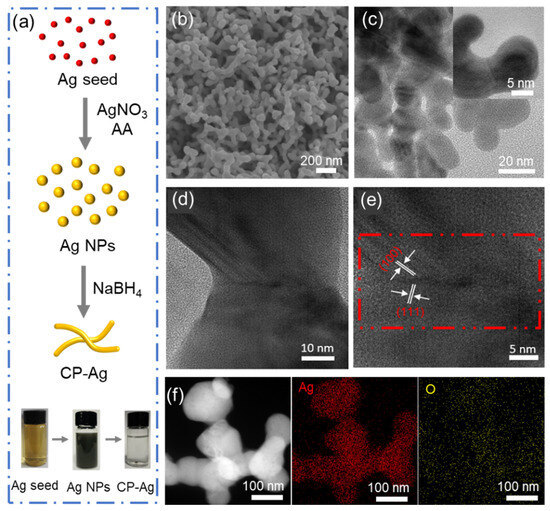 Figure 1f) confirms the uniform elemental dispersion of Ag and O. All these morphology results manifest the transition from dispersed AgNPs to interconnected porous CP-Ag.