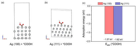 ads(*COOH)) using surfaces of Ag (100) and Ag (111). The configurations with adsorbed intermediates are given in