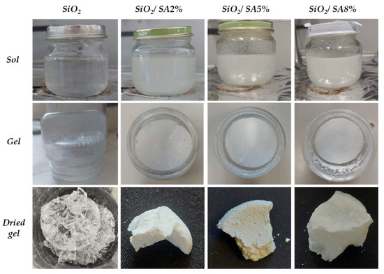SiO2/SA hybrids images compared to SiO2 in sol, gel, dried gel steps.