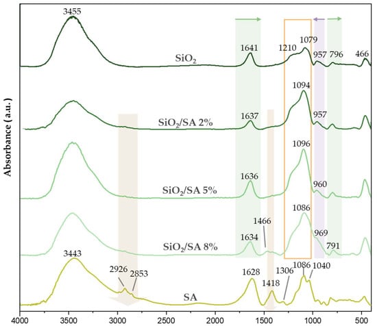 FTIR spectra of SiO2/SA hybrids. Pink arrows indicate increasing peak intensity; green filled squares indicate red shifts; violet filled squares indicate blue shifts; orange empty squares highlight the complex Si–O–Si band region.