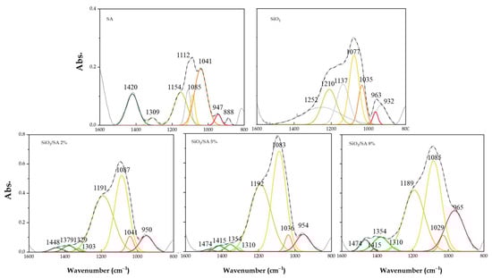 Deconvoluted spectra of SiO2/SA hybrids in the range of 1600–800 cm−1 compared to pure SiO2.
