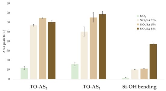 Area peak of deconvoluted Si-O-Si band in the range 1600–800 cm−1 of SiO2/SA hybrids in the range of 1600–800 cm−1 compared to SiO2. TO-AS2: 1210 cm−1 peak; TO-AS1: 1077–1085 cm−1 peak.