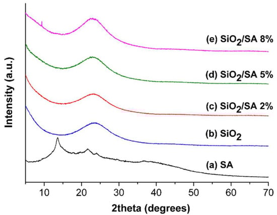 XRD profiles of pure SA and SiO2 and SiO2/SA hybrids materials prepared by sol–gel method.