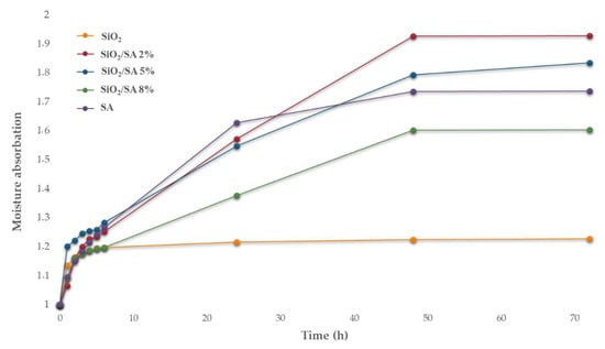 The hybrid SiO2/SA, SiO2, and SA samples were first ground and then dried under vacuum for 24 h to completely remove any residual moisture. Each sample was then individually placed inside a vacuum chamber maintained at a controlled relative humidity of 99% using a thermostat-regulated system. The sample weight was recorded at regular intervals: every hour for the first 8 h, and subsequently at 24 and 48 h. The experiment was carried out separately for each sample to avoid interactions between materials and to ensure consistent humidity conditions within the chamber.