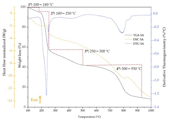 The thermal analyses of SiO2/SA hybrids were performed through simultaneous DSC/TGA with the Discovery SDT 650. The materials were ground before starting the analysis. Approximately 10 mg of each sample was placed in a 90 µL alumina crucible. Prior to TGA analysis, all samples were stabilized through an isothermal treatment at 30 °C for 20 min in order to remove physical absorbed water. The flow rate applied for the test was 100 mL/min with a heating rate of 5 °C/min, starting from 100 °C to 1000 °C in both hybrids and references (SA and SiO2), as reported by Fiorentino et al. 2024 [64]. Measurements were elaborated using TRIOS 5.1.1 (build 46572) software by TA Instruments (New Castle, DE, USA) and Origin 8 software.