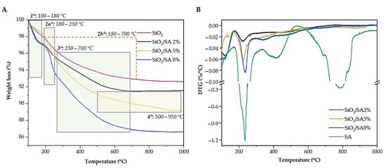 (A) TGA curves of SiO2/SA hybrids; (B) DTG curves of SiO2/SA hybrids compared to pure SA.