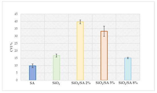 A cytotoxicity assessment was conducted using HaCaT cells, an established model of healthy human keratinocytes, to evaluate the biocompatibility of hybrid SiO2/SA materials in comparison with their individual components, i.e., pure SiO2 and pure sodium alginate (SA) (Figure 9). Both references exhibited low cytotoxicity, with cell viability inhibition (CVI%) values remaining below 20%. Interestingly, incorporation of 2% SA into the silica matrix (SiO2/SA 2%) led to a marked increase in cytotoxicity, elevating CVI% to approximately 40%. This trend was reversed at higher SA loadings: SiO2/SA 5% showed a CVI% of about 33%, still consistent with a good biocompatibility [61], and SiO2/SA 8% returned to values comparable to pure SiO2, around 15%. These results suggest that the cytotoxicity of the hybrids is not simply governed by the presence of SA, which is known to be biocompatible, but rather by the physicochemical changes introduced upon hybrid formation. BET analysis revealed that SiO2/SA 2% possessed a specific surface area nearly three times greater than that of pure SiO2, which may account for the enhanced interaction with cell membranes and the observed cytotoxicity. As the SA content increased, the surface area decreased accordingly, paralleling the drop in cytotoxic effects. This was also because of the anti-inflammatory effect of SA [62]. Furthermore, these findings are consistent with previous literature showing that an increased surface area in nanostructured materials can amplify cell–material interactions, leading to higher biological reactivity. As demonstrated by Spyrogianni et al. (2017), both particle size and surface area are critical determinants of silica nanoparticle cytotoxicity [63]. Overall, the data indicate that tuning the SA content in SiO2-based hybrids allows modulation of cytotoxicity, with intermediate compositions (e.g., 2–5%) requiring careful evaluation due to their heightened surface reactivity.