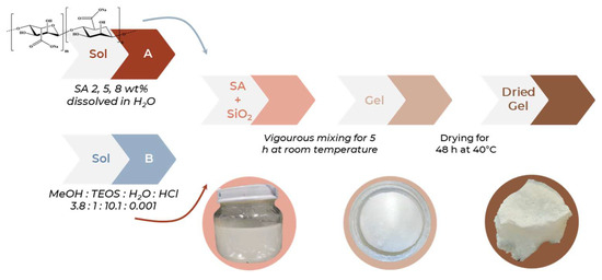 SiO2 and SiO2/SA hybrid materials containing 2, 5, and 8% of SA were synthesized via a sol–gel route. SA was purchased from Thermo Fisher Scientific (Waltham, MA, USA; Product number A18565, Lot 10242904), characterized by a low viscosity of 9 mPa·s (1% solution at 20 °C). The required amounts of SA, corresponding to 2, 5, or 8% by weight relative to the final SiO2 mass, were dissolved in deionized water and slowly added to the solution in a beaker placed on a magnetic stirrer at 40 °C. For the pure SiO2 sample, no SA was added. Tetraethyl orthosilicate (TEOS, Si(OC2H5)4, Sigma-Aldrich, St. Louis, MO, USA) was used as the silica precursor and dissolved in methanol (≥99.8%, HiPerSolv CHROMANORM®, gradient grade for HPLC, VWR; purchased from Sigma-Aldrich), which served as a co-solvent. Hydrochloric acid (HCl, 37% w/w, CAS No. 7647-01-0, MFCD00011324) was obtained from Sigma-Aldrich Fine Chemicals Biosciences (Product code H1758100ML, 100 mL). The SA solution was added dropwise to the TEOS/methanol mixture to obtain a stable, white, opalescent mixture free of visible aggregates or phase separation. The molar ratios employed for all samples were as follows: TEOS:SiO2 = 1; H2O:TEOS = 10.1; MeOH:TEOS = 3.8. The final sol was stirred at room temperature for 5 h. After stirring, the system was sealed to allow gelation. The resulting gels were dried in a static oven at 50 °C until complete solvent removal. The dried materials were then stored in airtight containers for further characterization (Figure 10).