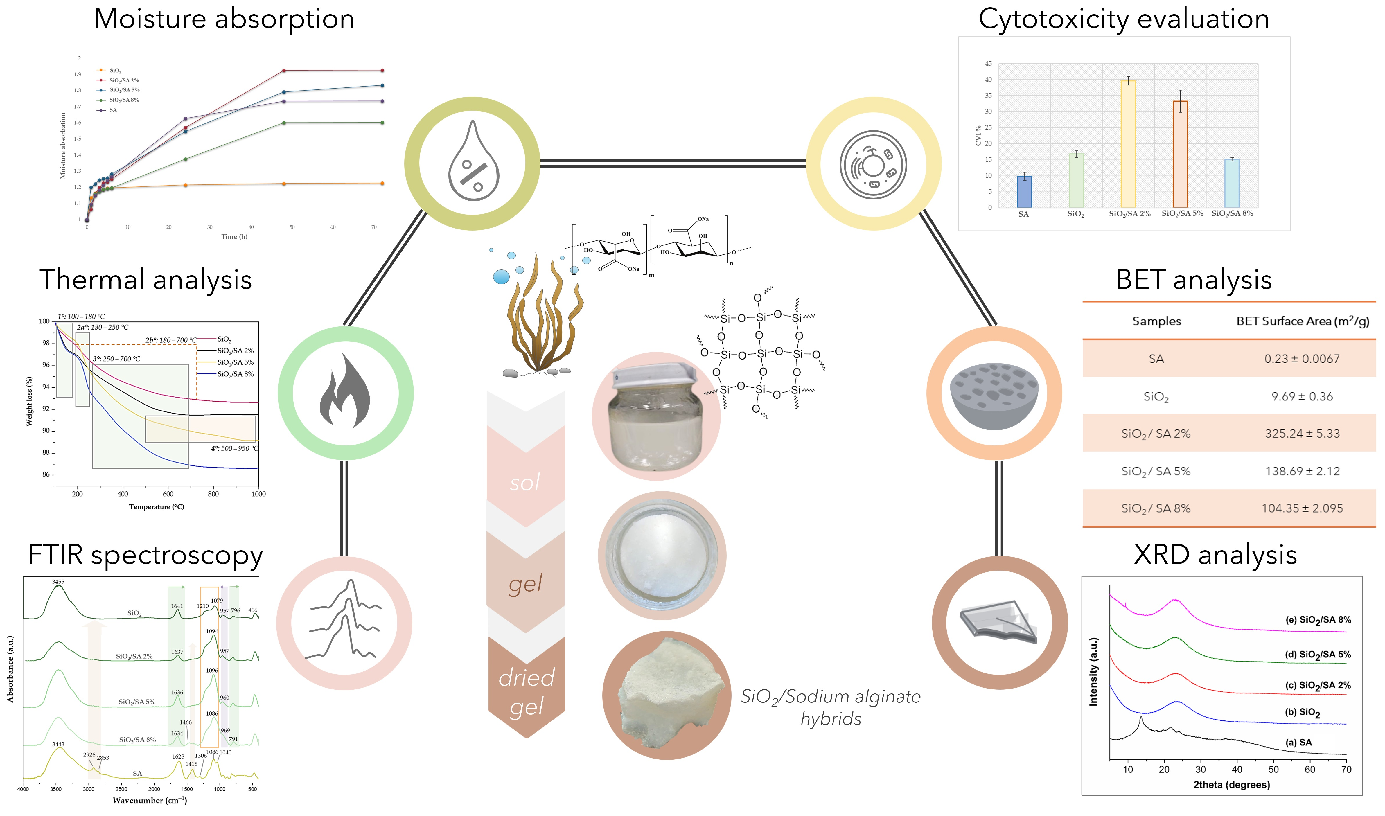 D’Angelo, A.; Mortalò, C.; Comune, L.; Raffaini, G.; Fiorentino, M.; Catauro, M. Sol–Gel Synthesized Silica/Sodium Alginate Hybrids: Comprehensive Physico-Chemical and Biological Characterization. Molecules 2025, 30, 3481. https://doi.org/10.3390/molecules30173481