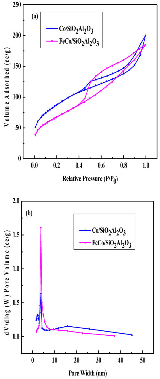 N2 adsorption–desorption: (a) isotherms and (b) pore size distribution plots of Co/SiO2Al2O3 and FeCo/SiO2Al2O3 catalysts.