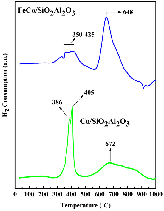 Temperature programmed reduction (TPR) with H2 was conducted to examine the reduction behavior of metal oxides and metal–support interactions that may have played a significant role. The H2-TPR profiles of all catalysts are presented in Figure 5. These profiles act as an important structural promoter during the reduction process, consistent with the BET surface area results shown in Table 4. Specifically, two distinct reduction peaks at 386 °C and 405 °C were observed for the Co/SiO2Al2O3 catalyst. These peaks were due to the reduction of Co3O4 to metallic Co [35]. The peak at 672 °C corresponded to the reduction of cobalt silicate. The peak shifted to a lower temperature after the addition of Al2O3 to the silica support [36]. This may be due to Al2O3 weakening the interaction between FeCo and SiO2. The H2-TPR profile of the FeCo/SiO2Al2O3 catalyst exhibited several overlapping reduction peaks between 350 °C and 425 °C, corresponding to the reduction of Co3O4 to metallic Co and Fe3O4 to FeO. A distinct peak at 648 °C was attributed to reduction of FeO to metallic Fe [46].