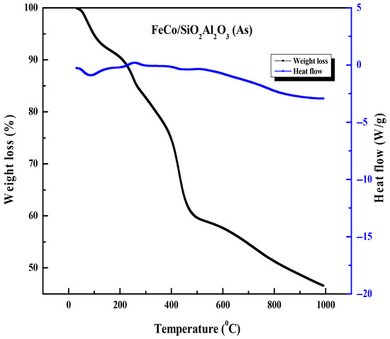 Thermogravimetric analysis and differential scanning calorimetry TGA-DSC thermograms of FeCo/SiO2Al2O3 (As) catalysts.