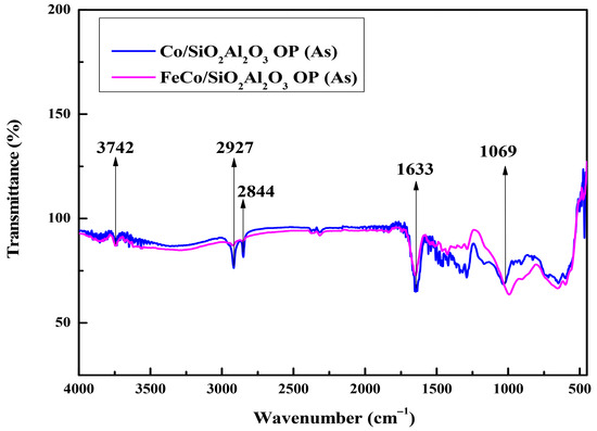 FTIR spectroscopy confirmed the presence of a silica layer on the iron nanoparticles, as evidenced by a characteristic absorption band near 1069 cm−1 [50]. This band, originally located at 1100 cm−1, was observed to shift to lower wavenumbers, indicating a weakening of the siloxane (Si-O-Si) bridges. This shift is attributed to interactions between the silica and surface hydroxyl groups on the iron nanoparticles. However, these silica-related bands disappeared upon the addition of Al2O3 in the silica layer of the Co/SiO2Al2O3 (As) and FeCo/SiO2Al2O3 (As) catalysts. The band at 1633 cm−1 corresponded to the bending vibration of hydroxyl groups from interlayer water molecules [40,51]. Additionally, absorption bands at 2844 and 2927 cm−1 were attributed to symmetric and asymmetric C-H stretching vibrations from organic species [52]. The broad band between 3750 and 3000 cm−1, observed at 3742 cm−1, is assigned to O-H stretching from water adsorbed on silanol groups on the silica surface [53]. The IR spectra of all calcined catalysts are shown in the supplementary section of the manuscript (Figure S1 (See Supplementary file)).