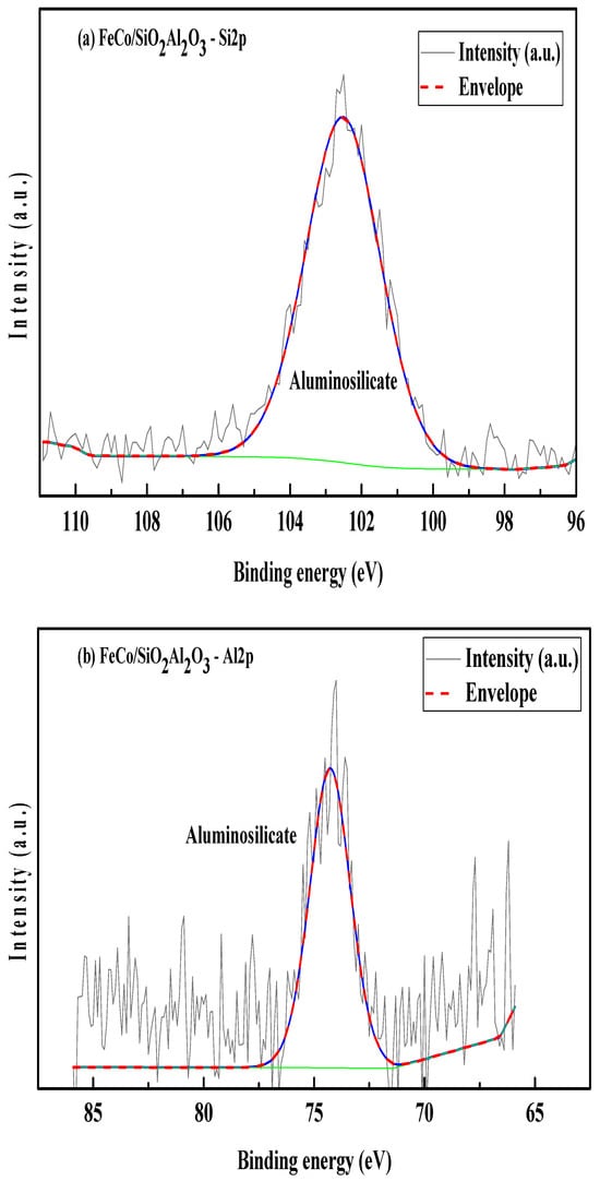X-ray photoelectron spectroscopy (XPS) was utilized to analyze the surface chemical composition and oxidation states of elements present in the FeCo/SiO2Al2O3 catalyst. Charge correction for all spectra was performed using the C 1s peak at 284.8 eV, corresponding to adventitious carbon (C–C bonds). The intensity in the spectra represents the measured value from the instrument, and envelope represents the resultant intensity from the deconvoluted peaks. Deconvolution of the C 1s spectrum revealed additional peaks attributed to oxygen-containing carbon species, including a component associated with O–C=O bonds, suggesting the presence of surface-bound carbon–oxygen functionalities [54]. Figure 8c shows the Si 2p XPS spectrum, featuring a single peak at a binding energy of 102.52 eV, confirming the presence of silicates in the FeCo/SiO2Al2O3 catalyst.