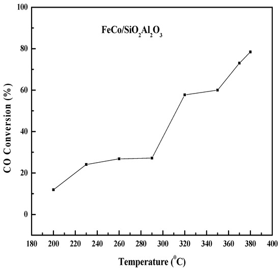 Fischer–Tropsch synthesis (FTS) reactions were conducted in a stainless steel microreactor over a temperature range of 200 °C to 350 °C to determine the optimum reaction temperature for CO conversion and hydrocarbon selectivity. The reactions were performed using a constant H2:CO molar ratio of 2:1, with a gas hourly space velocity (GHSV) of 12,000 h−1 and a pressure of 20 bar. The N2 gas flow rate was maintained at 1.5 mL/min. CO conversion and hydrocarbon selectivity were calculated using the equations below [57,58]. Although CO2 formation is important because of the water–gas shift reaction, it was not considered for the hydrocarbon selectivity calculation. The effect of reaction temperature on CO conversion and hydrocarbon selectivity for the Co/SiO2Al2O3 catalyst was discussed extensively in our previous paper [35].