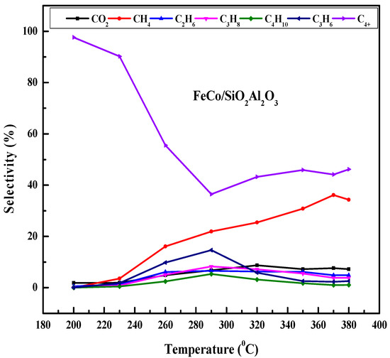 Figure 9 shows the effect of the reaction temperature on the CO conversion and product selectivity of the FeCo/SiO2Al2O3 catalyst. Initially, the CO conversion increased slowly up to 290 °C and then increased sharply to 57.7% at 320 °C. After that, the CO conversion increased further at higher temperatures. The CH4 selectivity increased up to 370 °C and then decreased [58]. The increasing trend in CH4 selectivity indicates that the catalyst was active for the methanation reaction. The presence of cobalt in the catalyst may facilitate the activation of CO2 (a byproduct of the FTS process), which can react with H2 to form CH4 [59]. At 290 °C, the selectivity for both CH4 (C1) and light hydrocarbons (C2-C4) reached their maximum, after which selectivity declined at higher temperatures (290–380 °C). In contrast, C4+ selectivity showed a decreasing trend with rising temperature up to 290 °C, then stabilized and remained nearly constant at higher temperatures. This is due to the higher reduction degree, lack of agglomeration of particles, and proper core–shell structure of this catalyst. The TPR, SEM, and TEM (Figure S2 (See Supplementary file)) results support the enhanced catalytic activity of this catalyst.