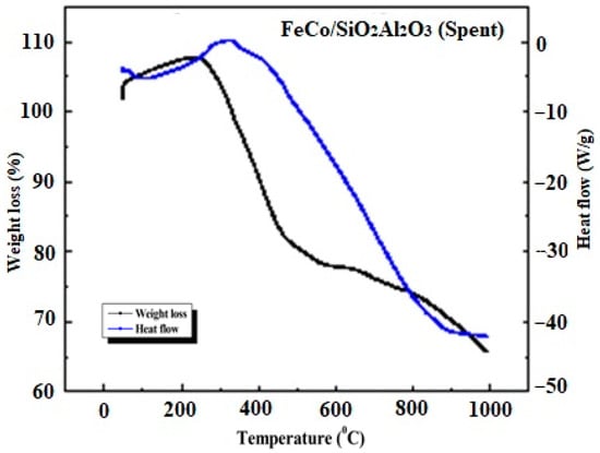 Thermogravimetric and differential scanning calorimetry (TGA-DSC) thermograms of spent FeCo/SiO2Al2O3 catalysts.
