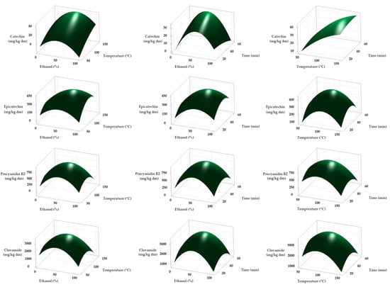 Response surface plots showing the effects of ethanol concentration (%), extraction temperature (°C), and extraction time (min) on the concentration of phenolic compounds from cocoa pod husk: catechin, epicatechin, procyanidin B2, and clovamide.
