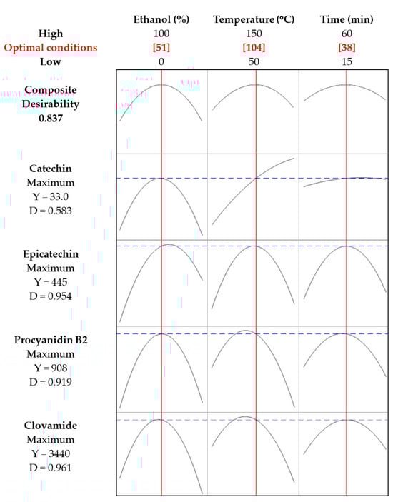 The composite desirability and individual desirability profiles (Figure 2) identified the optimal MAE conditions as 51% ethanol, 104 °C, and 38 min, yielding a composite desirability of 0.837. Clovamide and procyanidin B2 achieved the highest desirabilities (0.961 and 0.919, respectively), corresponding to yields of 3440 mg/kg dm and 908 mg/kg dm. Epicatechin exhibited a desirability of 0.954 with a yield of 445 mg/kg dm, aligning with findings by Maldonado and Figueroa [19], who showed that epicatechins remain stable and well-recovered under moderate-temperature MAE with ethanol-water mixtures and degrade only at excessive heat. In contrast, catechin showed the lowest desirability (0.583) and yield of 33.0 mg/kg dm.