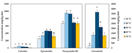 Effect of drying temperature on the concentration of phenolic compounds (catechin, epicatechin, procyanidin B2, and clovamide) in cocoa pod husk. Different letters above bars indicate significant differences among temperatures for each compound (Tukey’s test, p < 0.05).