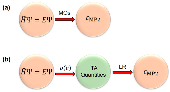 Figure 1. Comparison of (a) conventional MP2 method (with Hartree-Fock orbitals as input) and (b) linear regression LR(ITA) models used in this work, where the density-based information-theoretic approach (ITA) quantities are used as input. Here, MP2 is used only as a proof-of-concept.