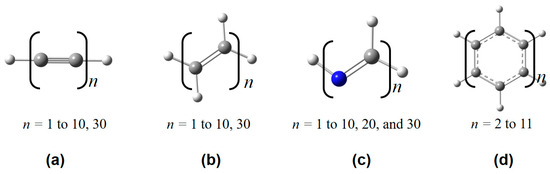 Figure 3. Some representative polymeric structures used in this work, including (a) polyyne, (b) polyene, (c) all-trans-polymethineimine, and (d) acene.