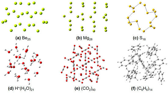 Figure 4. Some representative molecular structures used in this work, including (a) Ben, (b) Mgn, (c) Sn, (d) [H+(H2O)n], (e) (CO2)n, and (f) (C6H6)n clusters, respectively.