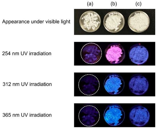 Appearance of (a) plain OCP, (b) OCP with incorporated 4-(carboxymethyl)benzoate ions, and (c) OCP with incorporated p-phenylenediacetate ions under visible and ultraviolet (UV) irradiation. Reprinted from reference [49] with permission from the Royal Society of Chemistry, 2024. (Note: The figures have been used after appropriate modification of the original images).