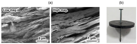 An HAp/β-TCP/pyrolytic carbon composite was prepared by sintering a compact composed of OCP with incorporated isophthalate ions in a nitrogen atmosphere [69]. Because the OCP with incorporated isophthalate ions was plate-shaped particles, a compact with a layered structure was spontaneously formed upon pressure moulding. This layered structure remained unchanged even after sintering (Figure 4a). Generally, ceramic-sintered bodies are weak against impact and easily destroyed. However, when a nail was hammered into the sintered body, only the area around the nail was broken, and the entire material did not break (Figure 4b), because the direction of crack propagation when the nail was hammered was deflected by the layered structure. This phenomenon is also observed in natural nacre [70,71] and is often applied in the design of artificial materials [72,73,74] to improve their damage tolerance. In addition, this material was found to be biocompatible in in vitro tests using SBF [69]. Although the crack-propagation control method is conventional, its application to calcium phosphate-based materials for artificial bone applications was reported for the first time. This composite is expected to contribute to the development of novel artificial bones that doctors and patients can use with confidence.