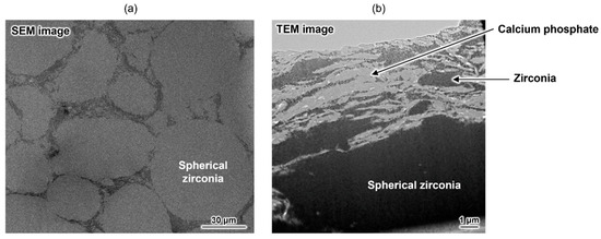 As mentioned above, a composite with excellent damage tolerance was obtained, but its strength did not reach that of conventional HAp-sintered bodies. To address this issue, an advanced composite was developed by combining zirconia, a known high-strength ceramic material, and the aforementioned calcium phosphate-based material [75]. This material has a unique macroscopic structure, mainly comprising spherical zirconia domains (Figure 5a). Plate-shaped calcium phosphate particles and a small amount of irregularly shaped zirconia particles formed a submicrometre-scaled layered structure at the grain boundary (Figure 5b). The bending strength of the composite was approximately 360 MPa, which is considerably higher than that of conventional HAp-sintered bodies (~100 MPa). This composite also demonstrated unique damage tolerance properties. Therefore, OCPCs can not only be used as functional materials themselves but can also be used for developing new materials with unique functionalities. Thus, this research area is worthy of attention.