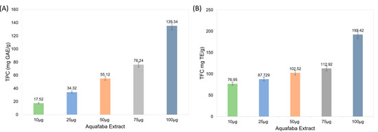 (A) Total phenolic content (TPC, mg GAE/g) and (B) total flavonoid content (TFC, mg TE/g) of aquafaba extract at different concentrations. Values represent mean ± SD (n = 3).