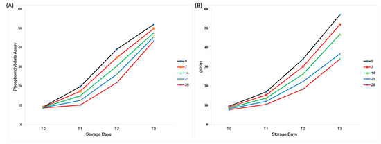 Effect of aquafaba and gum tragacanth on antioxidant activity of plant-based mayonnaise during 28 days of refrigerated storage, as determined by (A)phosphomolybdate assay and (B) DPPH radical scavenging assay. Values are expressed as mean ± SD (n = 3).