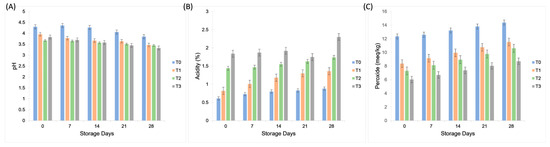 Effect of gum tragacanth and aquafaba on (A) pH; (B) acidity; and (C) peroxide value (meq/kg) of plant-based mayonnaise during 28 days of storage at 4 °C. Values represent mean ± SD (n = 3).