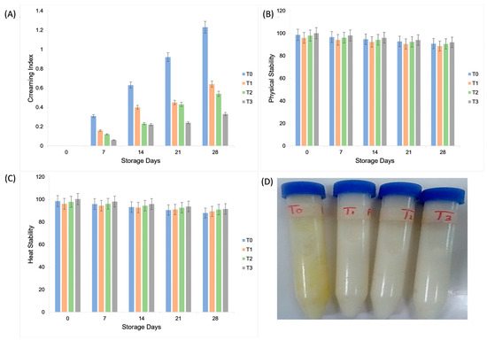 Effect of aquafaba and gum tragacanth on the (A) creaming index (%); (B) physical stability (%); and (C) heat stability (%) of (D) control and plant-based mayonnaise samples during 28 days of refrigerated storage. Values are expressed as mean ± SD (n = 3).