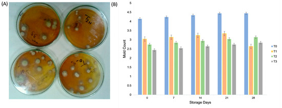 (A,B) Effect of aquafaba and gum tragacanth on mold counts (log CFU/g) of plant-based mayonnaise during 28 days of refrigerated storage. Values are expressed as mean ± SD (n = 3).