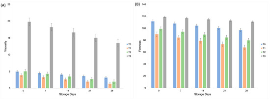 Effect of aquafaba and gum tragacanth on (A) viscosity (Pa·s) and (B) firmness (g) of plant-based mayonnaise during 28 days of refrigerated storage. Values are expressed as mean ± SD.