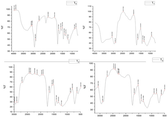 FTIR spectra of control mayonnaise (T0) and plant-based formulations (T1, T2, and T3) are presented. Across all samples, characteristic peaks were observed that correspond to major functional groups present in proteins, lipids, and polysaccharides. A strong absorption band at 3440 cm−1 was assigned to O–H stretching vibrations of phenols and hydroxyl groups, indicating the presence of antioxidant compounds. The band at 1743 cm−1 corresponded to ester C=O stretching, typically associated with lipids and emulsifying molecules, while a distinct absorption at 1630 cm−1 reflected carboxylic acid groups and amide I stretching in proteins. Additional peaks at 1429, 1516, and 1612 cm−1 were attributed to aromatic C=C, C=O, and C–C stretching, respectively, while bending vibrations of phenolic O–H groups were evident at 1359 cm−1. Differences among treatments were evident in peak intensities. The control sample (T0) exhibited lower absorbance at phenolic O–H (3440 cm−1) and carboxylic acid (1630 cm−1) regions compared to T2 and T3, reflecting the higher content of aquafaba-derived phenolic compounds in plant-based formulations. Similarly, ester-related bands (1743 cm−1) were more pronounced in T3, suggesting enhanced lipid–gum interactions contributing to emulsion stability. The spectra of T1 and T2 displayed intermediate values, consistent with their lower aquafaba and gum concentrations. These findings indicate that aquafaba and gum tragacanth contribute additional functional compounds such as phenolics, esters, and carboxylic acids that are absent or less prominent in egg-based mayonnaise. Their presence likely enhanced antioxidant activity and emulsion stability in plant-based samples, supporting the functional role of these ingredients in mayonnaise formulation. Thus, FTIR provides molecular-level confirmation that aquafaba–gum systems not only act as egg replacers but also enrich the product with bioactive components that improve quality and stability. The FTIR peak values in this study closely matched those reported by Khalid, et al. [32]. Figure 8 presents the FTIR spectra of the control (T0) and aquafaba–gum formulations (T1–T3). Characteristic peaks corresponding to esters, phenols, and carboxylic acids were observed, confirming the presence of functional groups associated with emulsifying and antioxidant properties.