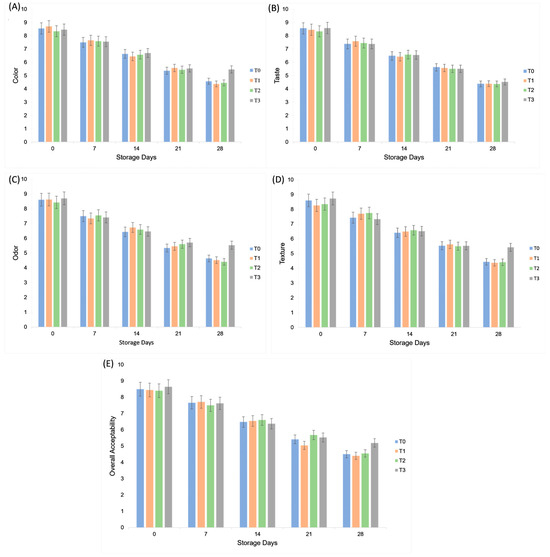 Effect of aquafaba and gum tragacanth on sensory parameters (A) color; (B) taste; (C) odor; (D) texture; (E) overall acceptability of plant-based mayonnaise during 28 days of refrigerated storage. Values represent mean ± SD from 12 trained panelists, evaluated in duplicate sessions.