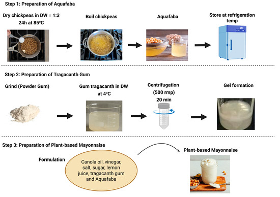 - Raikos, V.; Hayes, H.; Ni, H. Aquafaba from commercially canned chickpeas as potential egg replacer for the development of vegan mayonnaise: Recipe optimisation and storage stability. Int. J. Food Sci. Technol. 2019, 55, 1935–1942. [Google Scholar] [CrossRef]